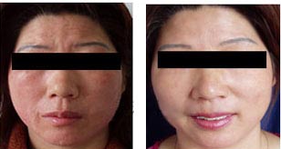 治疗前:31岁的赵女士喜欢用名贵的化妆品。不久前她的脸上出现了一些小疙瘩,就涂一些外用药。用了以后她发现病情缓解了,有的小疙瘩也消失了。可是,一停药就复发。