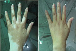 ▲病史:患者2年前发现手背出现白斑,后范围逐渐扩大,在当地医院治疗三个月无效后,放弃治疗。