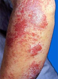 【疾病症状】该患者腿部瘙痒严重,又痛又痒,有血液渗出,并且有蔓延趋 势。既往史:海鲜过敏。