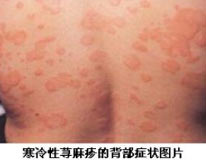 寒冷性荨麻疹是遇冷条件下,不同部位出现的瘙痒及风团。皮损可以局限于冷条件下暴露部位或接触寒冷物体的部位,也可泛发,可累及口腔粘膜,甚至表现为头痛,寒战,腹泻以及心动过速等。还有一种家族性寒冷性荨麻疹,常发生于婴幼儿期,在接触寒冷物质后发生皮疹,皮疹为红斑和风团,伴有发热、怕冷、关节痛、头痛等全身症状。